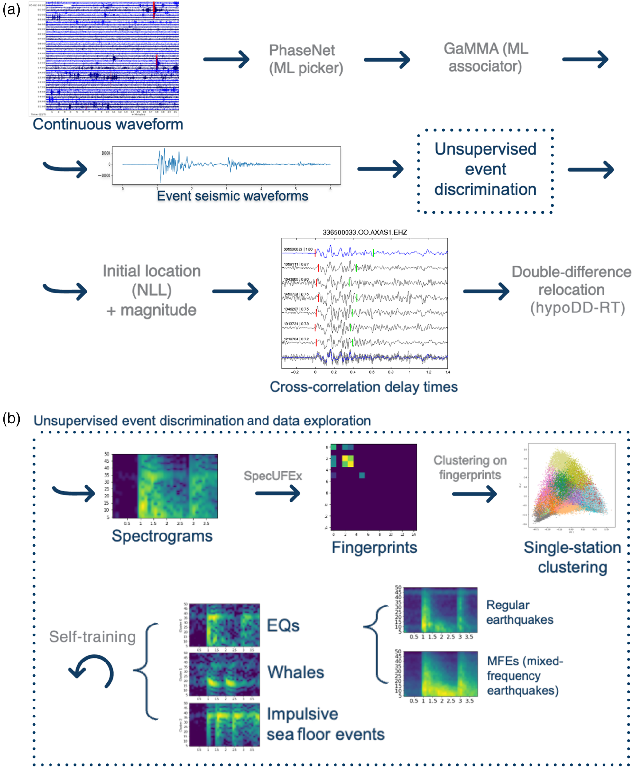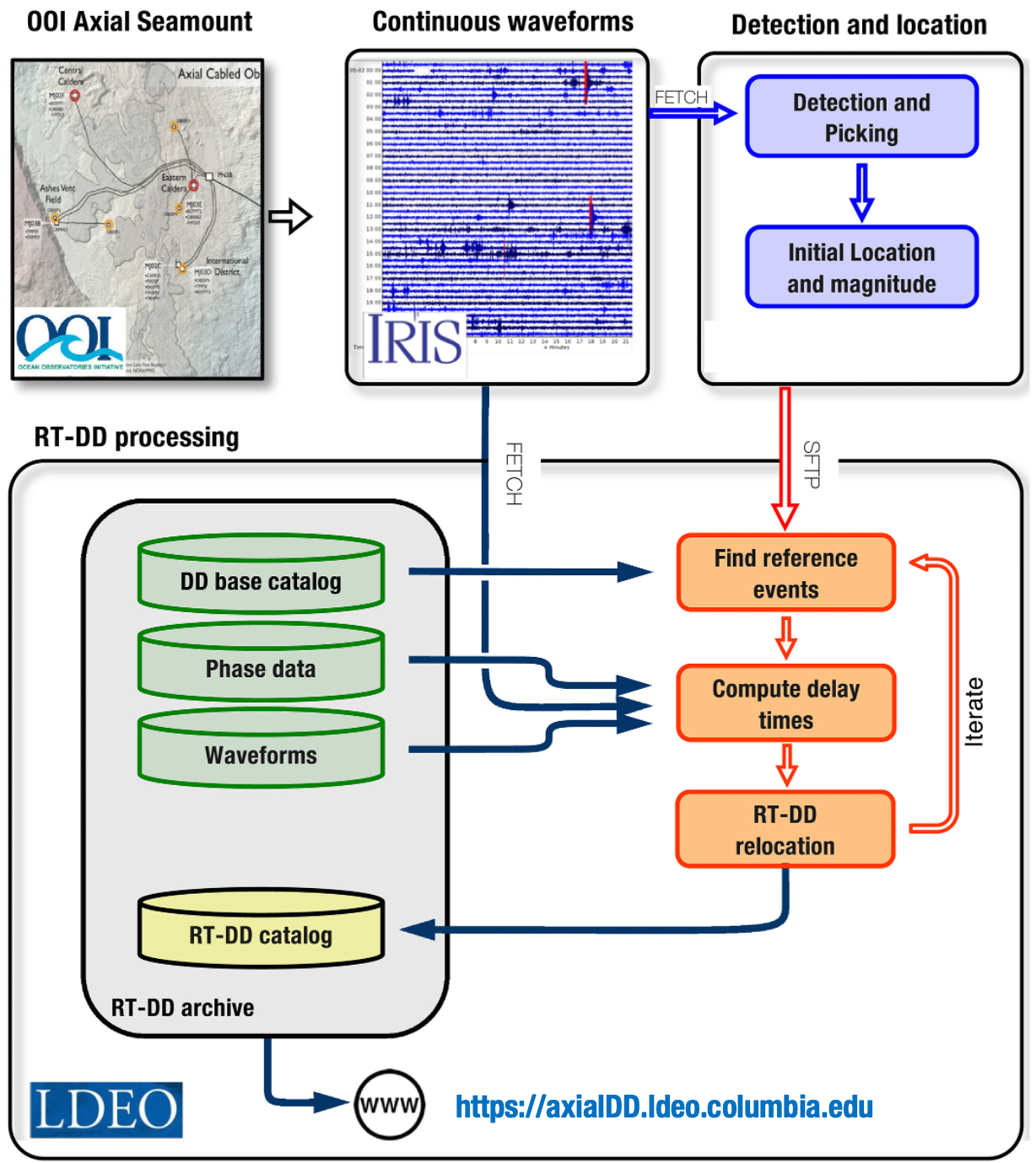 hypocenter locations for earthquakes recorded by the Ocean Observatories Initiative (OOI) cabled OBS array at Axial Seamount. The continuous waveform data is processed using machine-learning methods for detection, discrimination, phase arrival-time picking, and association [click here]. New events are then located relative to a high-resolution background (base) catalog using waveform cross-correlation and double-differences [click here]. For more details see here.